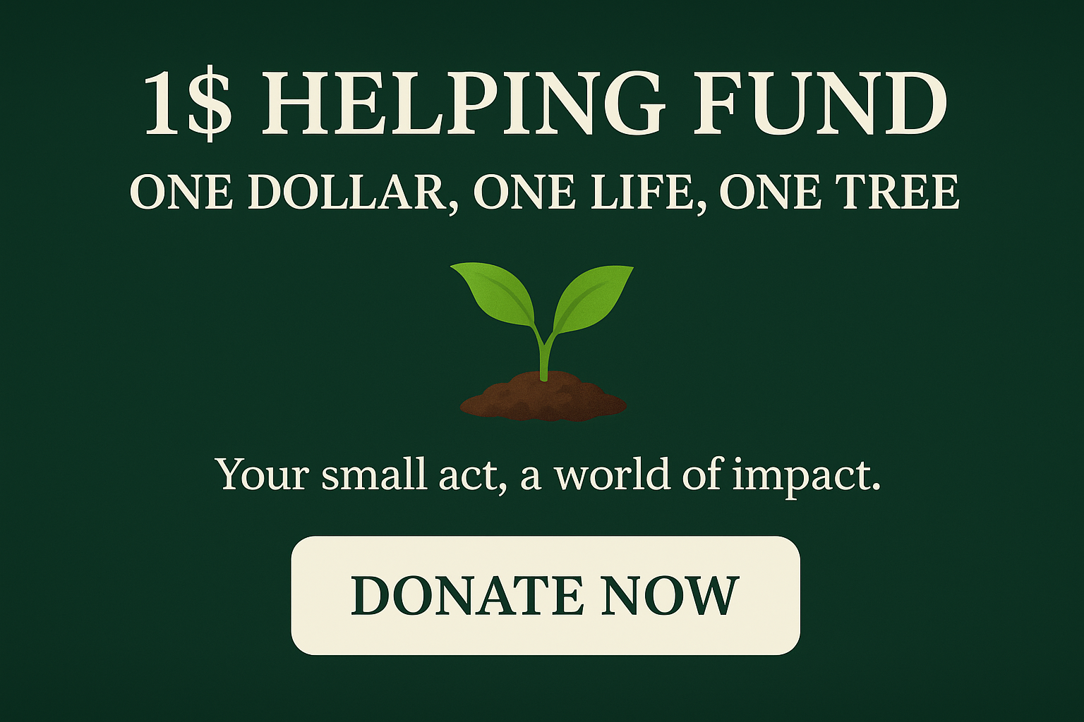 1$ Helping Fund – One Dollar, One Life, One Tree With just $1, you can provide a meal to someone in need and plant a tree, creating a meaningful impact from anywhere in the world. This small act spreads hope, supports sustainability, and connects lives across borders. “One Dollar. One Life. One Tree. Your small act, a world of impact.”